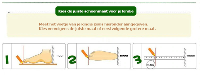 Meet het voetje van je kindje om er zeker van te zijn dat het perfect past. Klik hier voor onze meetinstructies. Elk kindje heeft unieke voetjes, dus kies de maat op basis van de voetlengte voor een comfortabele pasvorm. Staat de exacte maat er niet bij? Kies dan de eerstvolgende grotere maat. Heeft je kindje bijvoorbeeld een voetlengte van 11 cm, kies dan 11,5 cm als maat voor je bestelling.